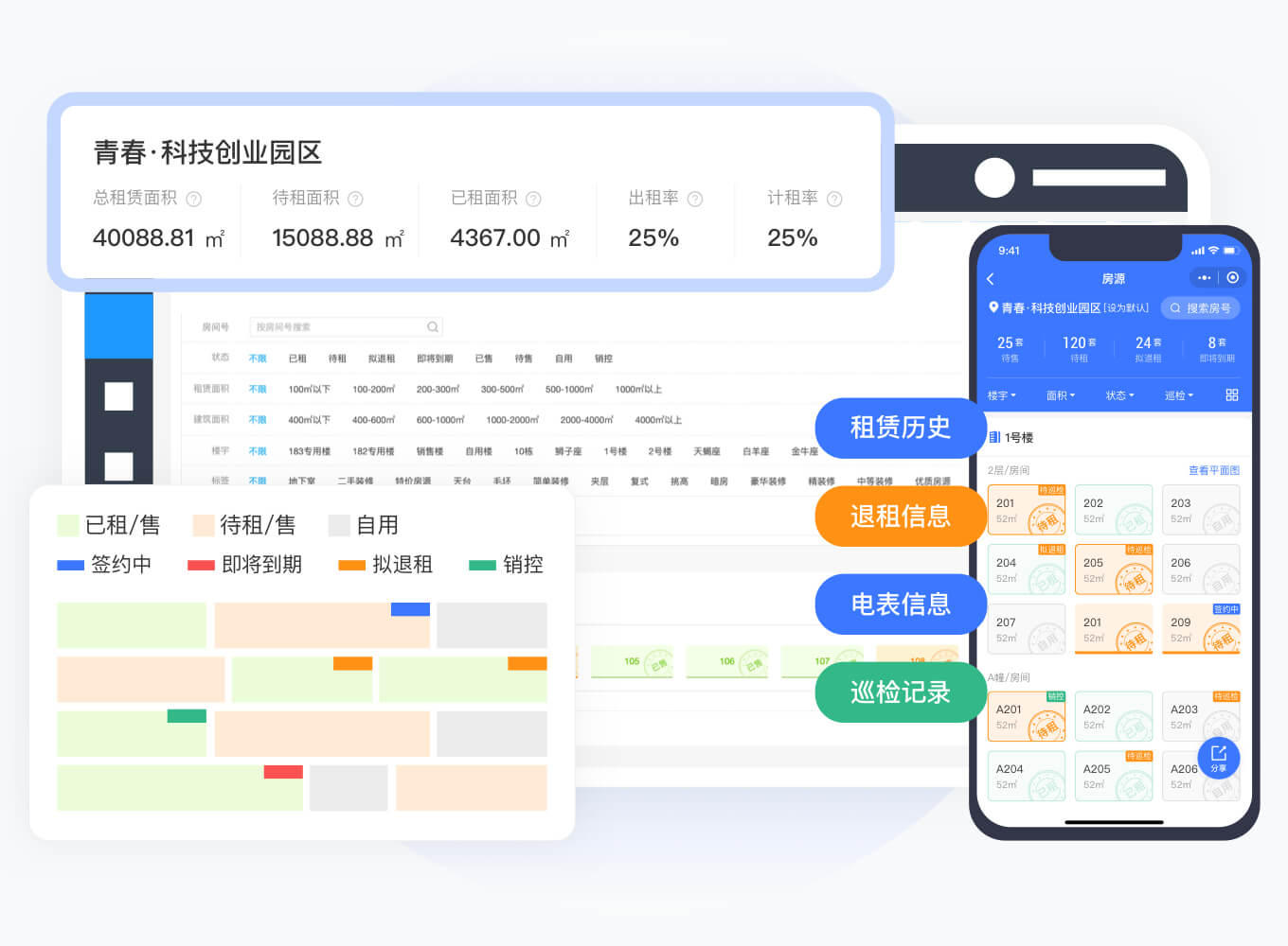 支持客户签约后的入驻办理、收费提醒、收入对账、客户开票、合同变更/续签/退租、退租验收等全业务场景管理